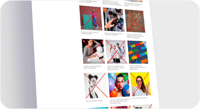 Motorola toolkit Imagery 54 02.06.2017 Never use awkward angles that don't communicate product features or benefits Always use colors from the Motorola palette Never use colors in backgrounds which aren't from our color palette Never use models that don't reflect our attitude Never apply other creative elements on top of products (pattern, color block, illustration) Never use cluttered interior or exterior environments Never use wardrobe which doesn't reflect our style and brand personality Always use interesting and engaging surfaces when using texture in photography Don't over-complicate pattern, textures and color of backgrounds Do not use B&W imagery Do not use overly styled talent or too many color combinations - be single minded Do not overly pose talent Do not apply other color effects to imagery style art direction Do not use overly exaggerated expressions Do not use talent that is overly stylized and forced expressions What not to do with imagery
