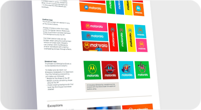 Motorola toolkit Motorola logo 12 02.06.2017 Logo versions Flat color logo The flat color logo can appear in any of the brand colors, except yellow, medium gray or light gray. Consider background colors and the product photography to create enough contrast for legibility and visual harmony. In all of the colors, the Wordmark is always used in white, except for when it’s on a yellow background – in this case the Wordmark can be black. Depending on your communication medium, or creative idea, you can use our logo in three different ways. Outline logo The Outline logo can appear in any of the brand colors. Always choose a color that helps unite the design layout. M ake sure there is sufficient contrast between the background and the ‘M’. Our clear-space rules can be broken when using the outline logo version at large scale. Imagery can interact with the Emsignia and/or wordmark with creative overlapping and see-through effects. Breakout logo The break-out Emsignia allows us to be expressive and playful. To make sure we retain our Emsignia trademark, it is important that the following overarching principles are followed: – Preserve the shape of the ‘M’ – Retain a circle containing shape around the ‘M’ – Avoid creating backgrounds that look like third logos have been created All breakout Emsignias created must be shared with the brand team for approval before using. Exceptions In exceptional cases only, we can use Flat and Outline logo versions where both the Wordmark and Emsignia are white. The Flat white logo can be used in 3D environments. All cases need approval by the brand team prior to use. Outline white logo Flat white logo