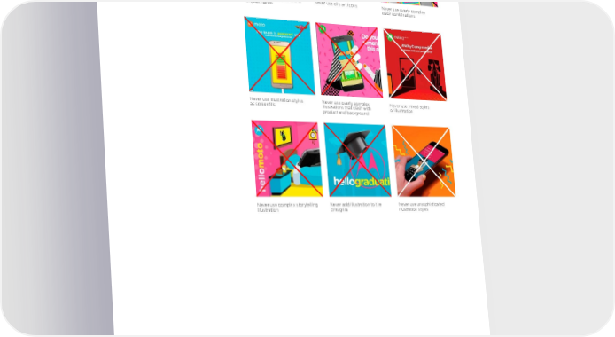 Motorola toolkit Illustration 61 02.06.2017 Never use badly drawn, overly complex hands Never use illustration styles as screenfills Never use overly complex color combinations Never use clip art icons Never use overly complex illustrations that clash with product and background Never use mixed styles of illustration Never use complex storytelling illustration Never add illustration to the Emsignia Never use unsophisticated illustration styles What not to do with illustration