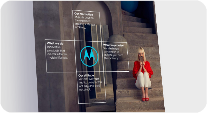 Motorola toolkit Overview 4 31.05.2017 Motorola Brand strategy Every successful brand has a model. Ours is called a ‘brand plus’. It explains in a few short sentences our motivation, what we do, what we promise, and our attitude. Our motivation To push beyond the expected and live a life less ordinary. Our attitude We are: lively not hectic, unexpected not silly, and bold not aloof. What we do Innovative products that deliver a better mobile lifestyle. What we promise We challenge convention to liberate you from the ordinary.