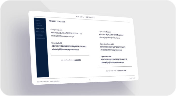 VISUAL IDENTITY LOGO PRIMARY TYPEFACES COLOR PALETTE TYPEFACES Georgia Regular Open Sans Regular SHIP LOGOS ABCDEFGHIJKLMNOPQRSTUVWXYZ ABCDEFGHIJKLMNOPQRSTUVWXYZ IMAGERY abcdefghijklmnopqrstuvwxyz abcdefghijklmnopqrstuvwxyz COLLATERAL Georgia Bold Open Sans Semi-Bold ABCDEFGHIJKLMNOPQRSTUVWXYZ ABCDEFGHIJKLMNOPQRSTUVWXYZ abcdefghijklmnopqrstuvwxyz abcdefghijklmnopqrstuvwxyz Open Sans Bold Use for headlines in ALL CAPS ABCDEFGHIJKLMNOPQRSTUVWXYZ abcdefghijklmnopqrstuvwxyz Use for body copy in sentence case MSC CRUISES USA | Brand Guidelines 15 March 2022