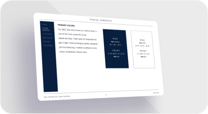 VISUAL IDENTITY LOGO PRIMARY COLORS COLOR Our MSC blue also known as “oxford blue” is PALETTE TYPEFACES one of the most powerful visual WEB WEB SHIP LOGOS assets we have. That’s why it’s important to HEX: #000033 HEX: #ffffff IMAGERY get it right. From printing to pixels, whatever R 0 | G 0 | B 51 R 255 | G 255 | B 255 COLLATERAL you’re producing, it needs to adhere to the PRINT PRINT colour breakdown shown here. C 100 | M 69 | Y 0 | K 69 C 0 | M 0 | Y 0 | K 0 PMS 282C PMS 000C MSC CRUISES USA | Brand Guidelines 14 March 2022