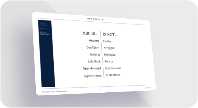 OUR IDENTITY BRAND POSITION VALUES BRAND MSC IS... IS NOT... PERSONALITY Modern Flashy Confident Arrogant Inviting Exclusive Laid Back Formal Open-Minded Opinionated Sophisticated Pretentious MSC CRUISES USA | Brand Guidelines 7 March 2022