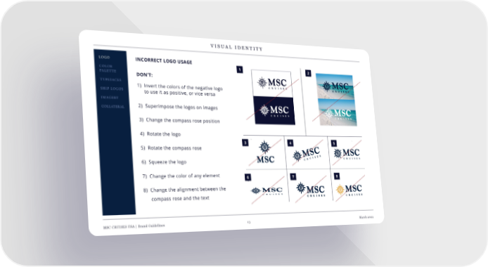 VISUAL IDENTITY LOGO INCORRECT LOGO USAGE COLOR 1 2 PALETTE DON’T: TYPEFACES 1) Invert the colors of the negative logo SHIP LOGOS to use it as positive, or vice versa IMAGERY COLLATERAL 2) Superimpose the logos on images 3) Change the compass rose position 4) Rotate the logo 3 4 5 5) Rotate the compass rose 6) Squeeze the logo 7) Change the color of any element 6 7 8 8) Change the alignment between the compass rose and the text MSC CRUISES USA | Brand Guidelines 13 March 2022