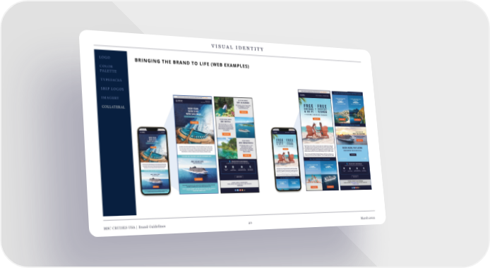 VISUAL IDENTITY LOGO BRINGING THE BRAND TO LIFE (WEB EXAMPLES) COLOR PALETTE TYPEFACES SHIP LOGOS IMAGERY COLLATERAL MSC CRUISES USA | Brand Guidelines 20 March 2022