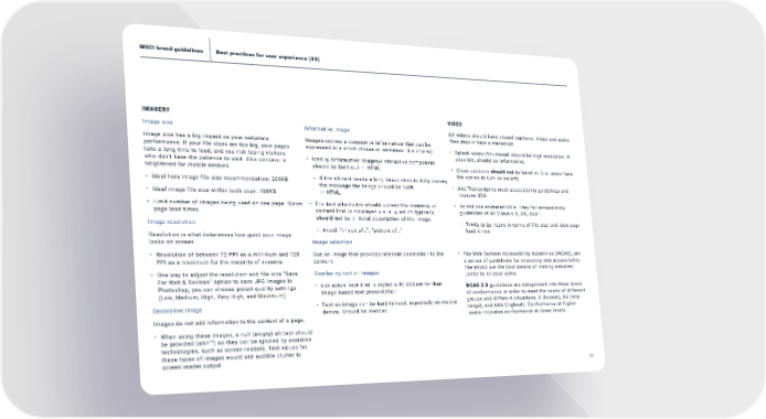 53 Best practices for user experience (UX) MSCI brand guidelines IMAGERY Image size Image size has a big impact on your website’s performance. If your file sizes are too big, your pages take a long time to load, and you risk losing visitors who don’t have the patience to wait. This concern is heightened for mobile devices. • Ideal hero image file size recommendation: 200KB • Ideal image file size within body copy: 100KB • Limit number of images being used on one page. Slows page load times. Image resolution Resolution is what determines how good your image looks on screen. • Resolution of between 72 PPI as a minimum and 120 PPI as a maximum for the majority of screens. • One way to adjust the resolution and file size “Save For Web & Devices” option to save JPG images in Photoshop, you can choose preset quality settings (Low, Medium, High, Very High, and Maximum) Decorative image Images do not add information to the content of a page. • When using these images, a null (empty) alt text should be provided (alt=””) so they can be ignored by assistive technologies, such as screen readers. Text values for these types of images would add audible clutter to screen reader output. Informative image Images convey a concept or information that can be expressed in a short phrase or sentence. (i.e charts) • Ideally, informative imagery/interactive component should be built out in HTML. - If the alt text needs a long description to fully convey the message the image should be built in HTML. • The text alternative should convey the meaning or content that is displayed visually, which typically should not be a literal description of the image. - Avoid: “image of...”, “picture of...” Image selection Use an image that provides relevant correlation to the content. Overlaying text on images • Use actual text that is styled with CSS rather than image-based text presentation. • Text on image can be hard to read, especially on mobile device. Should be avoided. VIDEO All videos should have closed captions. Video and audio files should have a transcript. • Splash screen/thumbnail should be high resolution. If possible, should be informative. • Close captions should not be burnt in. (i.e. users have the option to turn cc on/off) • Add Transcript to meet accessibility guidelines and improve SEO. • Do not use animated GIFs. They fail accessibility guidelines at all 3 levels A, AA, AAA*. - Tends to be heavy in terms of file size and slow page load times. * The Web Content Accessibility Guidelines (WCAG), are a series of guidelines for improving web accessibility. The WCAG are the best means of making websites useful to all your users. WCAG 2.0 guidelines are categorized into three levels of conformance in order to meet the needs of different groups and different situations: A (lowest), AA (mid- range), and AAA (highest). Conformance at higher levels indicates conformance at lower levels.