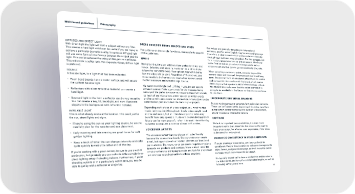 61 Videography MSCI brand guidelines DIFFUSED AND DIRECT LIGHT With direct light the light will hit the subject without any filter. This creates a hard light which can be useful if you are trying to achieve a particular dramatic quality. In contrast, diffused light will use some form of interference between the subject and the light. This can be achieved by using a filter, gels or a reflector. This will create a softer look. For corporate videos, diffuse light is preferred. BOUNCE A bounce light, is a light that has been reflected. • Foam bead boards have a matte surface and will create the softest bounce light. • Reflectors with silver reflective material can create a hard light. • Bounced light in the form a reflector can be very versatile. You can create a key, fill, backlight, and even illuminate objects in the background with reflective material. AVAILABLE LIGHT This is what already exists at the location. This could just be the sun, street lights and signs. • If you’re using the sun as your lighting source, be sure to carefully plan for the weather and sun placement. • Early morning and late evening are great times for soft golden lighting. • Keep a track of time: the sun changes intensity and color quite quickly towards the latter end of the day. If you’re working with a green screen, be sure to use a well-lit production, but generally you can make do with a simple three- piece lighting setup if shooting indoors. Furthermore, if you’re shooting outside or in a particularly well-lit area, you may be able to get by with a reflector or single key. DRESS CODE FOR PHOTO SHOOTS AND VIDEO For guidance on dress code for videos, please refer to page 80 of the guidelines. MUSIC Background audio gives videos a more professional feel and tempo. Selecting and sourcing music can be a rather tricky subject for corporate video. Your options may be limited by how the video will be used. Regardless of the end use, your music needs to be licensed and royalty-free to avoid social media takedowns and potential legal trouble. We recommend bright and uplifting music, but are open to different genres if it is appropriate for the message being conveyed. We prefer instrumental tracks to those with vocals, as most of our videos have either spoken or written words and lyrics will cause unwanted distraction. Always download a watermarked preview to test the track in your project. Depending on the type of video project, you may find that music isn’t required throughout. Sizzle videos might need end to end music, but an interview or promo video may benefit from only sporadic music or a bookended approach. Music can be more powerful when it is used intermittently, to better accentuate a point or climax in the video. VOICEOVER ARTISTS The voiceover artist that you choose will quite literally become the voice of our brand. The right voice can create a real, lasting emotional connection between our brand and our customer. The wrong voice can create negative emotions towards our products and services. Make a short list of the emotions that you are trying to evoke and look for a voiceover artist whose voice best embodies those emotions. Our videos are generally targeting an international audience, and for some English may be a second language. Therefore, a clear accent which will be understandable by most of your audience would be ideal. For this purpose, opt for a middle range American or British accent. Whichever is the final selection, you should always aim to select voiceover artists that denote gender and racial diversity. When selecting a voiceover artist, consider beyond the current video and how well they represent our brand long term. People can form an emotional attachment to a voice and connect it intrinsically with the brand, which makes choosing one that speaks to MSCI’s brand values critical. You should also make sure that the voice over artist is going to be available in the future so that we can continue to use them. INCORPORATE OUR VISUAL BRANDING Be sure to always use our corporate font and design elements. These can be featured at the beginning of the video, have them in the bottom corner throughout the duration of the content, and/or include our intro/outro screens. CAPTIONS While it is important to use subtitles, it is even more important not to burn them into the video and be sure to have a transcript, for a better user experience, if the video is destined for web upload. PRIORITIZE CONSISTENCY IN VIDEO CAMPAIGNS If you’re creating a video series, consistency should be considered. People should watch our videos and recognize the style, format, and general message, as it will make the overall campaign much more impactful as a result. It’s typically a good call to have a similar intro and/or outro in the video series, and to opt for similar video lengths, as well as following same general tone.