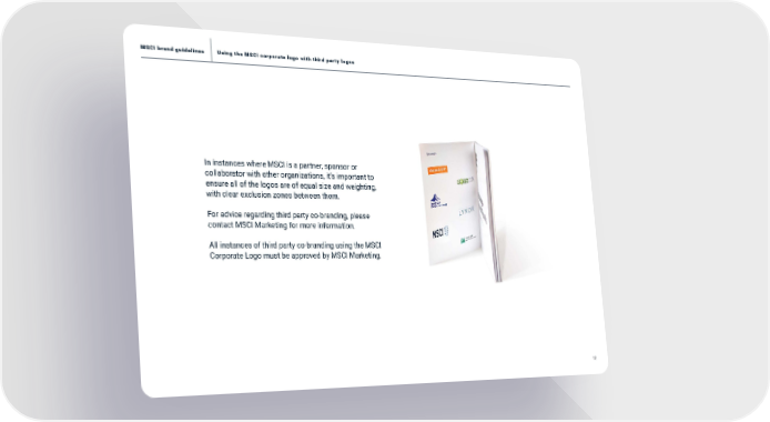 12 MSCI brand guidelines Using the MSCI corporate logo with third party logos In instances where MSCI is a partner, sponsor or collaborator with other organizations, it’s important to ensure all of the logos are of equal size and weighting, with clear exclusion zones between them. For advice regarding third party co-branding, please contact MSCI Marketing for more information. All instances of third party co-branding using the MSCI Corporate Logo must be approved by MSCI Marketing.