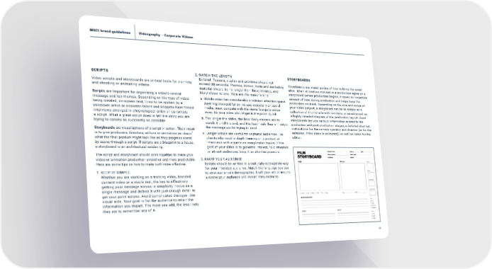 59 MSCI brand guidelines Videography - Corporate Videos SCRIPTS Video scripts and storyboards are critical tools for planning and shooting or animating videos. Scripts are important for organizing a video’s central message and key themes. Depending on the type of video being created, on-screen text, lines to be spoken by a voiceover artist or onscreen talent and snippets from filmed interviews arranged in chronological order all constitute a script. What a great script does is tell the story you are trying to convey as succinctly as possible. Storyboards are visualizations of a script in action. Their intent is to give producers, directors, editors or animators an idea of what the final product might look like as they progress scene by scene through a script. If scripts are a blueprint to a house, a storyboard is an architectural rendering. The script and storyboard should work together to make your video or animation production smoother and more predictable. Here are some tips on how to make both more effective: 1. KEEP IT SIMPLE Whether you are working on a training video, branded content video or a sizzle reel, the key to effectively getting your message across is simplicity. Focus on a single message and deliver it with just enough detail to get your point across. Avoid complicated dialogue. Use visual aids. Your goal is for the audience to retain the information you impart. The more you add, the less likely they are to remember any of it. 2. WATCH THE LENGTH Be brief. Teasers, sizzles and previews should not exceed 30 seconds. Promos, demos, touts and marketing material should be no longer than three minutes, and likely closer to one. Here are the reasons why: a. Mobile video has considerably shortened attention spans. Anything intended for online use, especially on social media, must compete with the viewer’s urge to swipe away. So your video should get to the point. Quick. b. The longer the video, the less likely viewers are to watch it until the end, and the less likely they will retain the message you’re trying to send. c. Longer videos are useful for captured audiences like clients who need in-depth training on a product or interviews with experts on complicated topics. If the goal of your video is to generate interest, hold attention or attract audiences, keep it as short as possible. 3. KNOW YOUR AUDIENCE Scripts should be written in a culturally-appropriate way for your intended audience. Match the language you use to your audience’s demographic. Craft your script around a scene your audience will immediately relate to. STORYBOARDS Storyboards are visual guides of how to bring the script alive. When all parties involved in a production agree on a storyboard before production begins, it saves an incredible amount of time during production and helps keep the production on-track. Depending on the size and scope of your video project, a storyboard can be as simple as a collection of thumbnails with numbers, or as advanced as a highly detailed diagram of the production layout. Good storyboards include various information related to the production and post-production stages, a detailed shot list, instructions for the camera operator and director (or for the animator, if the video is animated), as well as notes for the editor.