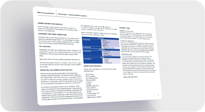 62 MSCI brand guidelines Videography - Animation/Motion graphics ANIMATION/MOTION GRAPHICS As with footage, motion graphics also need to start with a script and a storyboard. Please refer to the corporate videos section in the guidelines. CONSIDER YOUR VIDEO OBJECTIVES Consider what you are trying to achieve with this video and the points you are trying to get across. This will determine the type of animation that is most suitable. Regardless of the animation type, it should always respect MSCI’s brand attributes. THE AUDIENCE Information-led videos are a great way to share information that essentially is going to drive a rational decision or communicate something of value to your audience (stats, figures, broad data). Story-driven videos help in the emotional decision-making process. All audiences make decisions in different ways. This will need to be when making a decision about the type of the animation you choose. WHERE WILL BE ANIMATION BE HOSTED? Before commencing the development of the storyboard, consider where the animation will reside and how audiences will interact with it. Will it be a banner on a webpage? A GIF in an email? A video announcing a product launch or instructing audiences in a product’s use? Will it be hosted on social media or on a dedicated landing page? A physical or online event? All of these considerations factor into an animation. If the video is an awareness piece targeting people in their personal life via social media or broadcast advertising, something more conversational is more suitable. If, on the other hand, it is an internal training video, something a little more formal might be appropriate. If the only channel for displaying the video is via a landing page, be sure to be clear and concise in the messaging. It is advisable not to try and include all details in a 2-minute-long video. As a guidance, for a 60-second animation script, one should aim for 140 words. Below is our recommended animation length at the different touch points of an audience’s journey: ATTRACT 10 SECONDS • Social • Brand films • Culture • Explainer 30 SECONDS • Thought-leadership CONVERT 60 SECONDS • Explainers • Tutorials • Case-studies CLOSE 2 MINUTES + • Tutorials • Culture • Testimonials ANIMATION CATEGORIES The list below illustrates some of the animation styles MSCI produces: • 2D character • 2D iconography • 2D motion graphics • 2D hand drawn • Abstract • Collage • Exploding diagrams • Feature promo • Kinetic typography • Overlay • Photomontage 2.5D • User interface • Whiteboard animations CONTENT TYPES ANIMATED DEMO VIDEO According to b usiness.com , viewers retain 95% of a message when they watch it in a video compared to 10% when reading it in text. The amount of information retained in one minute of online video is equal to around 1.8 million written words. CHARACTER ANIMATION Creating an animated character to represent a product, brand or service can be as efficient as a speaker when trying to convey a message to the audience. Including a character animation in a video will also help it stand out from other videos. Animated characters can be given traits and characteristics that target a particular audience and support the overall message. CORPORATE VIDEO The main difference between a corporate video and more conventional video advertising is its audience. While in broadcast advertising commercials use broad messages for the general audience, corporate videos are more precise. The purpose of the videos can be to onboard new employees, used as part of a training process, demo how a product or service can work for a customer, show the impact of corporate social responsibility efforts or other topics. Corporate videos are more detailed than conventional advertising, which is designed to use snippets of information to prompt viewers to discover more on their own. EVENT HIGHLIGHT VIDEO