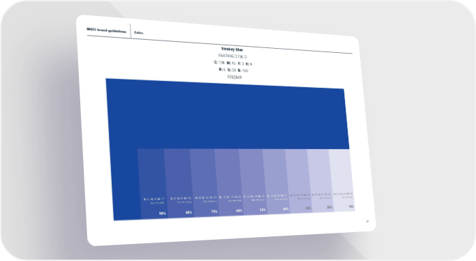 22 Color MSCI brand guidelines Smokey Blue PANTONE 2736 C C: 100 M: 85 Y: 0 K: 0 R: 6 G: 38 B: 169 #0626a9 R: 30 G: 59 B: 177 Hex: #1e3bb1 90% R: 55 G: 81 B: 186 Hex: #3751ba 80% R: 80 G: 103 B: 195 Hex: #5067c3 70% R: 105 G: 125 B: 203 Hex: #697dcb 60% R: 130 G: 146 B: 212 Hex: #8292d4 50% R: 155 G: 168 B: 221 Hex: #9ba8dd 40% R: 180 G: 190 B: 229 Hex: #b4bee5 30% R: 205 G: 212 B: 238 Hex: #cdd4ee 20% R: 230 G: 233 B: 246 Hex: #e6e9f6 10%