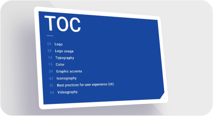 2 TOC 03 Logo 08 Logo usage 14 Typography 19 Color 39 Graphic accents 42 Iconography 51 Best practices for user experience (UX) 54 Videography