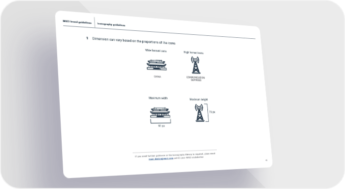 45 MSCI brand guidelines Iconography guidelines 1 Dimension can vary based on the proportions of the icons COMMUNICATION SERVICES Wide format icons 73 px 91 px Maximum height Maximum width High format icons CHINA If you need further guidance or the iconography library is required, plase email [email protected] and CC your MSCI stakeholder