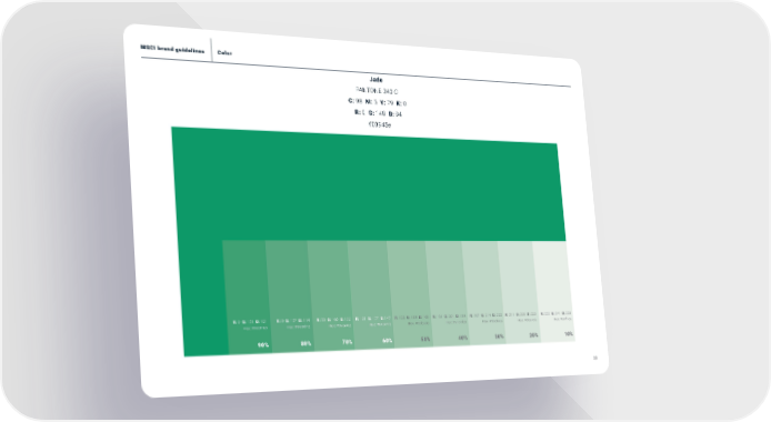 33 Color MSCI brand guidelines Jade PANTONE 340 C C: 98 M: 5 Y: 79 K: 0 R: 0 G: 148 B: 94 #00945e R: 0 G: 151 B: 101 Hex: #009765 90% R: 0 G: 157 B: 114 Hex: #009d72 80% R: 58 G: 166 B: 130 Hex: #3aa682 70% R: 101 G: 177 B: 147 Hex: #65b193 60% R: 133 G: 189 B: 166 Hex: #85bda6 50% R: 161 G: 201 B: 184 Hex: #a1c9b8 40% R: 187 G: 214 B: 202 Hex: #bbd6ca 30% R: 211 G: 228 B: 220 Hex: #d3e4dc 20% R: 233 G: 241 B: 238 Hex: #e9f1ee 10%