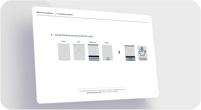 46 MSCI brand guidelines Iconography guidelines 2 Use the following structure as the icon layout Frame Icon Empty area Name ICON NAME ICON NAME If you need further guidance or the iconography library is required, plase email msci_design@msci.com and CC your MSCI stakeholder