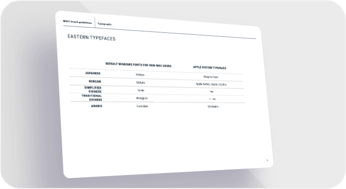 18 Typography MSCI brand guidelines EASTERN TYPEFACES DEFAULT WINDOWS FONTS FOR NON-MAC USERS APPLE SYSTEM TYPEFACES JAPANESE Meiryo Hiragino Sans KOREAN Dotum Apple Gothic, Apple LiGothic SIMPLIFIED CHINESE YaHei Hei TRADITIONAL CHINESE JhengHei Li Hei ARABIC DinArabic DinArabic