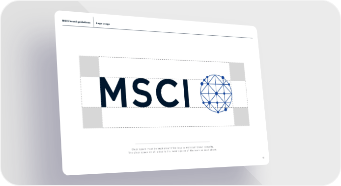 MSCI Brand Book Page 9 Page 1110 Logo usage MSCI brand guidelines Clear space must be kept around the logo to maintain brand integrity. The clear space on all sides is the inner square of the mark as seen above.