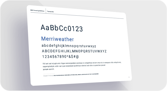 16 Typography MSCI brand guidelines AaBbCc0123 Merriweather abcdefghijklmnopqrstuvwxyz ABCDEFGHIJKLMNOPQRSTUVWXYZ 1234567890*&$#@ Vid unt aut oLupta nis ilique nonsequatem essimus re voluptibea dolorro ma nia is esequas sitia voluptio mi, saperspisApis volor aut que nesendam ipiditibus siminci aut alis si quaectae parunt porum earcill. PRIMARY TYPEFACE FOR PROFESSIONALLY DESIGNED ARTWORK ONLY, WHEN LARGE BLOCKS OF TEXT ARE REQUIRED