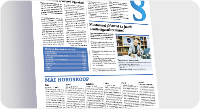 12 kasulikku / meelelahutus Mustamäe 13. mai 2024 Mais saab tasuta õigusnõu Mustamäel ja Lasnamäel Tallinna linn pakub elanikele tasu- kaadid, kohtutäiturid. Nõustamine toi- ta õigusnõu nõustamispäevadel, mis mub eesti, vene ja inglise keeles. Eelre- toimuvad graafiku järgi igas linna- gistreerimist ei toimu. osas. Järgmised nõustamispäevad on Nõustamisele võib minna endale so- 16. mail kell 9-13 Mustamäe ning bival kuupäeval sõltumata sellest, mil- 30. mail kell 9-14 Lasnamäe linna- lises linnaosas elatakse. osa valitsuses. 2024. aasta esimesel poolaastal Õigusnõustamise päeva raames on või- saab õigusnõu veel järgmistel ae- Päevakeskuse kevadised tegemised malik tasuta õigusnõu saada perekon- gadel: naõiguse, pärimisõiguse, võlaõiguse, le- ▶ 16. mail kell 9-13 Mustamäe linna- Lõpuks ometi on kevad käes ja loo- da kohti Ohtu mõisas 01.07 ja 03.07 pinguõiguse, tööõiguse, maksuõiguse, osa valitsuses (Vilde tee 118) detavasti ilmataadi üllatused möö- - tarbijakaitse, täitemenetluse ja korteri- ▶ 30. mail kell 9-14 Lasnamäe linna- toimuvatele etendustele „Tutvumis das. Aga me ei lase ennast sellis- kuulutus“, hind 34 €, buss väljub kell ühistutega seotud küsimustes, samuti osa valitsuses (Pallasti 54) test üllatustest segada. Oleme mit- 18.00 ikka Maxima eest. suhtlemisel kohalike omavalitsuste või ▶ 6. juunil kell 9-14 Kristiine linna- mel pool Eestimaal ringi reisinud Päevakeskuses kohapeal on meil riigiasutustega. osa valitsuses (Metalli 5) ning ees ootavad suvised teatrikü- kõik nii nagu tavaliselt. Huviringid Õigusnõu annavad Eesti Juristide Lii- ▶ 13. juunil kell 13-18 Põhja-Tallin- lastused. toimuvad kuni maikuu lõpuni, see- du spetsialistid – notarid, juristid, advo- na valitsuse (Kari 13) järel ootab ees suvepuhkus. Juuksurid, 23. aprillil oli meil reis nimega „Šo- maniküür, pediküür töötavad juulini. keeriv Ida-Virumaa“. Juba hommi- Päevakeskus puhkab 01.07 – 04.08. kul oli „šokeeriv“ ilm, aga kõik, kes 22.05 kell 12.30 kutsume teid Mustamäel jätkuvad ka juunis - tulema pidid, olid kohal ja reis kuju Päevakeskuse kevakontserdile,kus nes tänu giid Markole üllatavaks ning - esinevad solistid ansamblist „Har tasuta õigusnõustamised meeldejäävaks. Käisime vahepeal ka moonia“. bussireisil Paldiskis ja Padisel. Teatri- 30.05 kell 12 avatakse Männi reisid viisid meid aga Rakverre ja Tar- pargis ülelinnaline Seenioride suve- Maikuus saab registreerida nõustamistele, tusse. Rõõmsaks teeb, et saame pak- simman. On laulu ja tantsu Tallinna mis toimuvad 6. ja 20. juunil. Õigusnõusta- kuda nii palju huvitavaid elamusi ka Päevakeskuste kollektiivide esituses. mine toimub nii eesti kui vene keeles. Vaja- Tallinnast välja sõites. Ja päris palju Päevajuht Jaan Kirss, tantsuks esineb lik on eelregistreerimine tel 645 7500. sõite on veel ees. Kui sa veel pole en- bänd Estonia Brass. Pange see kuu- nast ühelegi reisile kirja pannud, tule päev kindlasti oma kalendrisse kirja! Nõustamisele registreerunu saab õiguslikke sel- läbi ning vaatame ehk leiame mida- Ilusat ja tegusat kevadet! gitusi, infot ja/või suuniseid edasiseks tegevu- gi sulle sobivat. Täna on veel pakku- Mustamäe Päevakeskus seks enda eelregistreeritud küsimustele järg- mistes õigusvaldkondades: Mustamäe Päevakeskuse hinnakiri ▶ Perekonnaõigus (elatis, hooldusõigused, suht - JUUKSELÕIKUS 6,00 € luskord jms) KEEMILINE LOKK 17.00 – 20.00 € ▶ Asjaõigus: (eelkõige omandiga seotud küsi - JUUKSURI KOJUKUTSE KOOS TÖÖGA 17.00 € mused jms) MANIKÜÜR 6.00 € ▶ Võlaõigus (lepingu täitmisest ja rikkumisest RIPSMETE/ KULMUDE VÄRVIMINE 3.00 € tulenevad nõuded, üürilepingud jne) Õigusnõustaja Vahur Kõlvart PEDIKÜÜR 12.00 € ▶ P ärimisseadusega seonduv konsultatsioon ▶ Magistrikraad International University Audentes ülikoolis, lisaks kõrgha- MASSAAŠ 0,5h 15.00 € ▶ Pankrotiseaduse ja täitemenetlusega seon - ridus ka ärijuhtimises ja tehniline eriharidus. SAUN 1h 5.00 € duv konsultatsioon ▶ Töötab õigusbüroos HUGO OÜ, kus on kliente nõustanud ja esindanud SUPP 1.50 € üle 6 aasta. PRAAD 3.00 € NB! Nõustamist ei osutata väärteo- ja kriminaal- ▶ Tallinna linnavolikogu liige, Mustamäe linnaosakogu liige. asjades ja ka korteriühistuga seotud küsimustes. MAI HOROSKOOP Jäär Sõnn Kaksikud Vähk Lõvi Neitsi 21. märts – 19. aprill 20. aprill – 20. mai 21. mai – 21. juuni 22. juuni – 22. juuli 23. juuli – 22. august 23. august – 22. september Tegutsemislusti ja julgust on sul Viimast kuud liigub õnnetoov Ju- Kuni 20. maini on energia pigem Tahad end kangesti tööalaselt Eriti kiires sõiduvees on need Lõ- Oled eriliselt julge ja seiklusal- ohtralt – sel kuul on sulle toeks piter Sõnni märgis, lisaks toetavad sisemaailma suunatud. Tuleb va- tõestada, näidata, milleks sa suu- vid, kel vaja sel kevadel õpingud dis. Maailm tundub sulle avasta- Jäära märgi juhtplaneet, energiline sind ka energiaallikas Päike ning nade asjadega tegeleda, otsi kok- teline oled. Sul jagub julgust ja teo- lõpule viia. Eksamid ja muud proo- mist vääriva, põneva paigana. Oled Marss. Tema toel oled valmis jõuli- armastuse planeet Veenus. Mai on ku sõlmida, teha suurpuhastust tahet, suudad alustada uusi pro- vilepanekud ei hirmuta sind. Vas- valmis uuteks kogemusteks, tahad selt tööd murdma ja oma unistuste kuu, mil taevased väed sind eri- nii enda südames kui ümbritse- jekte ja pürgida jõuliselt oma ees- tupidi – näed neis võimalust teis- piire avardada. Võimalik, et avas- nimel pingutama. Lihtsam on te- liselt õnnistavad! Küllap tunned vas keskkonnas. Ikka selleks, et märkide poole. Kui esile kerkib tu- telegi demonstreerida, kui tark ja tad enda jaoks mingi uue ala, mil- ha asju, mille eest ainuisikuliselt end hästi ja mõnusalt, tahad elu seal leiduks piisavalt ruumi uuele gevaid konkurente, siis see ainult tugev sa oled! Kõ