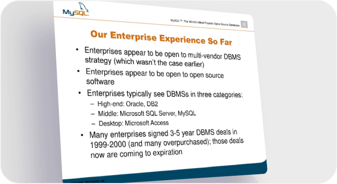 MySQL™: The World’s Most Popular Open Source Database 65 Our Enterprise Experience So Far • Enterprises appear to be open to multi-vendor DBMS strategy (which wasn’t the case earlier) • Enterprises appear to be open to open source software • Enterprises typically see DBMSs in three categories: – High-end: Oracle, DB2 – Middle: Microsoft SQL Server, MySQL – Desktop: Microsoft Access • Many enterprises signed 3-5 year DBMS deals in 1999-2000 (and many overpurchased); those deals now are coming to expiration Copyright 2003 MySQL AB