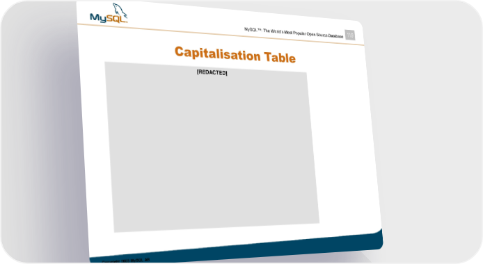 MySQL™: The World’s Most Popular Open Source Database 119 Capitalisation Table Open Ocean S.à.r.l [REDACTED] 1,000,000 Industrifinans SMB III ASA 292,132 Holtron Capital Fund I Ky 122,492 ScopeVentureCapital 96,910 split on Scope Venture I KB, Erneholm & Haskel AB, and Ichor Holding SA Texcel International AB 25,560 Sirius Consulting Ab 16,390 Terje Laugerud 16,390 Kaj S Arnö 15,000 John Wattin 8,870 TMD Holding Ltd (N Bhatia) 8,190 Caversham Trustees Ltd (M Gouran) 8,190 Peter Harris 4,920 Employee share option pool 120,000 TOTAL outstanding shares & options 1,735,044 Copyright 2003 MySQL AB