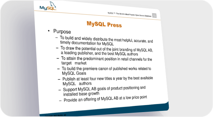 MySQL™: The World’s Most Popular Open Source Database 152 MySQL Press • Purpose – To build and widely distribute the most helpful, accurate, and timely documentation for MySQL – To draw the potential out of the joint branding of MySQL AB, a leading publisher, and the best MySQL authors – To attain the predominant position in retail channels for the target market – To build the premiere canon of published works related to MySQL Goals – Publish at least four new titles a year by the best available MySQL authors – Support MySQL AB goals of product positioning and installed base growth – Provide an offering of MySQL AB at a low price point Copyright 2003 MySQL AB