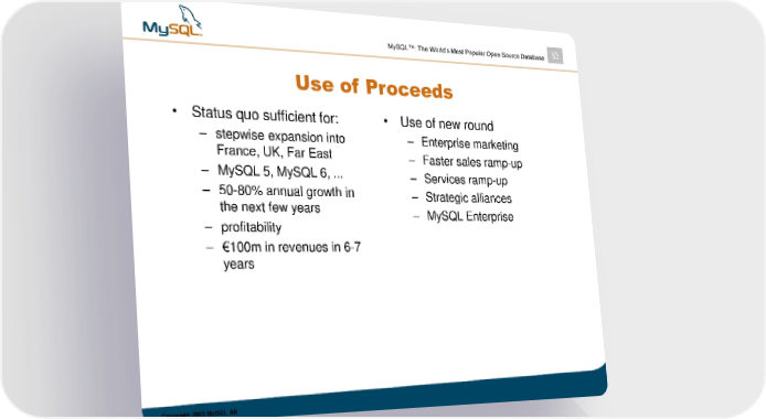 MySQL™: The World’s Most Popular Open Source Database 83 Use of Proceeds • Status quo sufficient for: • Use of new round – stepwise expansion into – Enterprise marketing France, UK, Far East – Faster sales ramp-up – MySQL 5, MySQL 6, ... – Services ramp-up – 50-80% annual growth in – Strategic alliances the next few years – MySQL Enterprise – profitability – €100m in revenues in 6-7 years Copyright 2003 MySQL AB