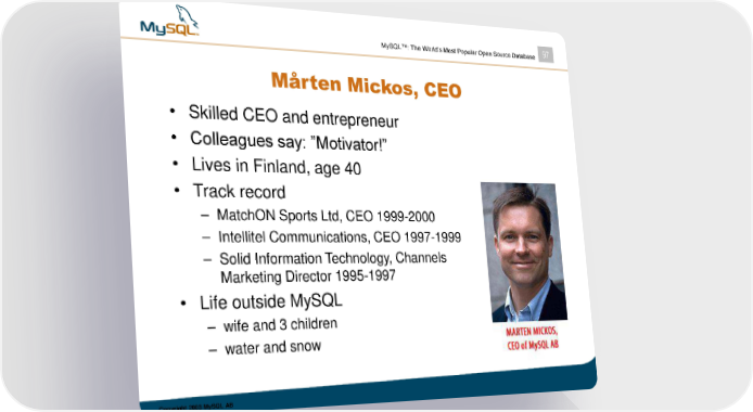 MySQL™: The World’s Most Popular Open Source Database 97 Mårten Mickos, CEO • Skilled CEO and entrepreneur • Colleagues say: ”Motivator!” • Lives in Finland, age 40 • Track record – MatchON Sports Ltd, CEO 1999-2000 – Intellitel Communications, CEO 1997-1999 – Solid Information Technology, Channels Marketing Director 1995-1997 • Life outside MySQL – wife and 3 children – water and snow Copyright 2003 MySQL AB