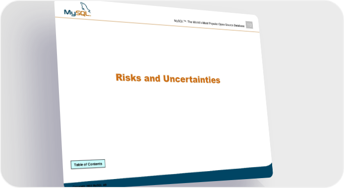 MySQL™: The World’s Most Popular Open Source Database 113 Risks and Uncertainties Table of Contents Copyright 2003 MySQL AB MySQL Page 112 Page 114