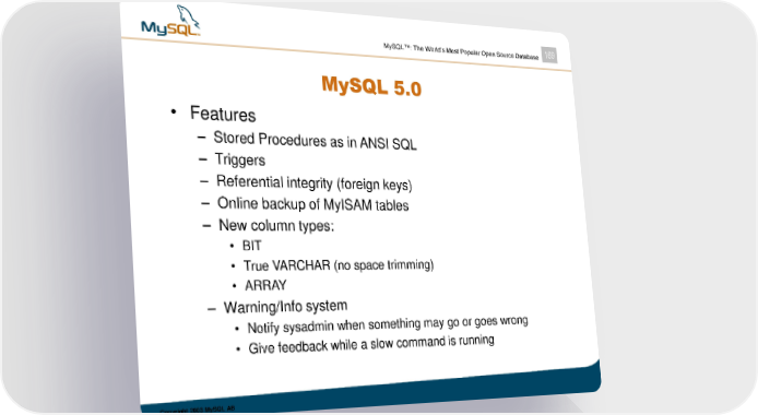 MySQL™: The World’s Most Popular Open Source Database 169 MySQL 5.0 • Features – Stored Procedures as in ANSI SQL – Triggers – Referential integrity (foreign keys) – Online backup of MyISAM tables – New column types: • BIT • True VARCHAR (no space trimming) • ARRAY – Warning/Info system • Notify sysadmin when something may go or goes wrong • Give feedback while a slow command is running Copyright 2003 MySQL AB