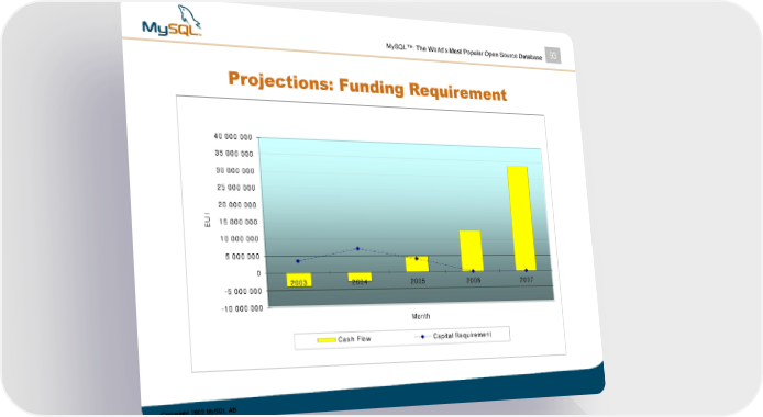 MySQL™: The World’s Most Popular Open Source Database 93 Projections: Funding Requirement 40 000 000 35 000 000 30 000 000 25 000 000 20 000 000 R U 15 000 000 E 10 000 000 5 000 000 0 -5 000 000 2003 2004 2005 2006 2007 -10 000 000 Month Cash Flow Capital Requirement Copyright 2003 MySQL AB