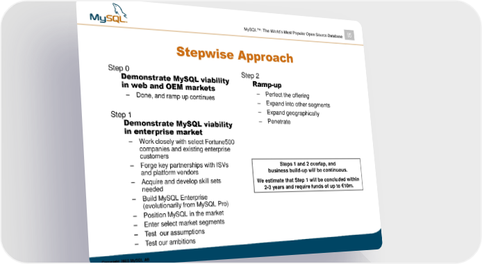 MySQL™: The World’s Most Popular Open Source Database 85 Stepwise Approach Step 0 Step 2 Demonstrate MySQL viability Ramp-up in web and OEM markets – Perfect the offering – Done, and ramp up continues – Expand into other segments Step 1 – Expand geographically Demonstrate MySQL viability – Penetrate in enterprise market – Work closely with select Fortune500 companies and existing enterprise customers – Forge key partnerships with ISVs Steps 1 and 2 overlap, and and platform vendors business build-up will be continuous. – Acquire and develop skill sets We estimate that Step 1 will be concluded within needed 2-3 years and require funds of up to €10m. – Build MySQL Enterprise (evolutionarily from MySQL Pro) – Position MySQL in the market – Enter select market segments – Test our assumptions – Test our ambitions Copyright 2003 MySQL AB