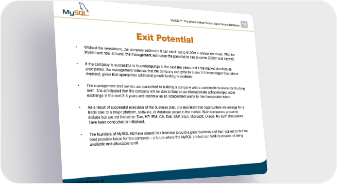 MySQL™: The World’s Most Popular Open Source Database 125 Exit Potential • Without the investment, the company estimates it can reach up to €100m in annual revenues. With the investment now at hand, the management estimates the potential to rise to some €200m and beyond. • If the company is successful in its undertakings in the next few years and if the market develops as anticipated, the management believes that the company can grow to a size 2-5 times bigger than above depicted, given that appropriate additional growth funding is available. • The management and owners are committed to building a company with a sustainable business for the long term. It is anticipated that the company will be able to float on an internationally acknowledged stock exchange in the next 3-4 years and continue as an independent entity for the foreseeable future. • As a result of successful execution of the business plan, it is also likely that opportunities will emerge for a trade sale to a major platform, software, or database player in the market. Such companies presently include but are not limited to: Sun, HP, IBM, CA, Dell, SAP, Intuit, Microsoft, Oracle. No such discussions have been conducted or initialised. • The founders of MySQL AB have stated their intention to build a great business and their interest to find the best possible future for the company – a future where the MySQL product can fulfill its mission of being available and affordable to all. Copyright 2003 MySQL AB