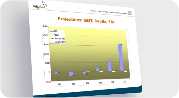 MySQL™: The World’s Most Popular Open Source Database 92 Projections: EBIT, CapEx, FCF 50 000 EBIT 40 000 Capex Free Cash Flow Cumulative FCF 30 000 20 000 10 000 0 -10 000 2002 2003 2004 2005 2006 2007 Copyright 2003 MySQL AB MySQL Page 91 Page 93