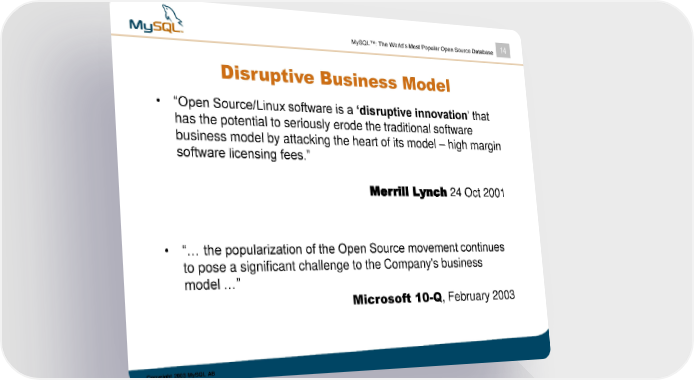 MySQL™: The World’s Most Popular Open Source Database 14 Disruptive Business Model • “Open Source/Linux software is a ‘disruptive innovation’ that has the potential to seriously erode the traditional software business model by attacking the heart of its model – high margin software licensing fees.” Merrill Lynch 24 Oct 2001 • “… the popularization of the Open Source movement continues to pose a significant challenge to the Company's business model …” Microsoft 10-Q, February 2003 Copyright 2003 MySQL AB
