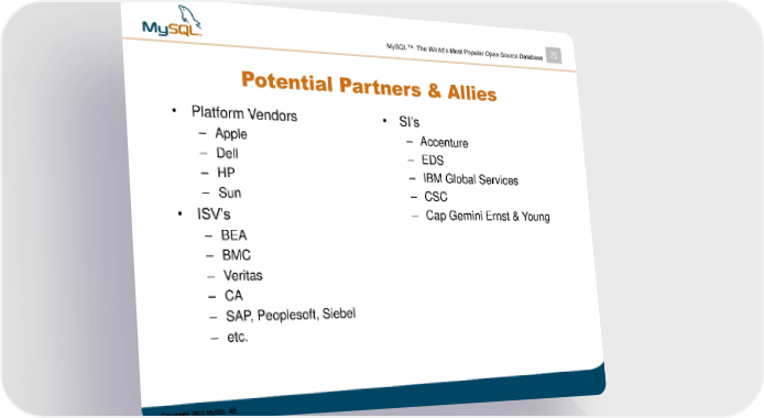 MySQL™: The World’s Most Popular Open Source Database 79 Potential Partners & Allies • Platform Vendors • SI’s – Apple – Accenture – Dell – EDS – HP – IBM Global Services – Sun – CSC – Cap Gemini Ernst & Young • ISV’s – BEA – BMC – Veritas – CA – SAP, Peoplesoft, Siebel – etc. Copyright 2003 MySQL AB