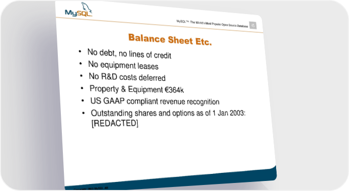 MySQL™: The World’s Most Popular Open Source Database 45 Balance Sheet Etc. • No debt, no lines of credit • No equipment leases • No R&D costs deferred • Property & Equipment €364k • US GAAP compliant revenue recognition • Outstanding shares and options as of 1 Jan 2003: [REDACTED] Copyright 2003 MySQL AB