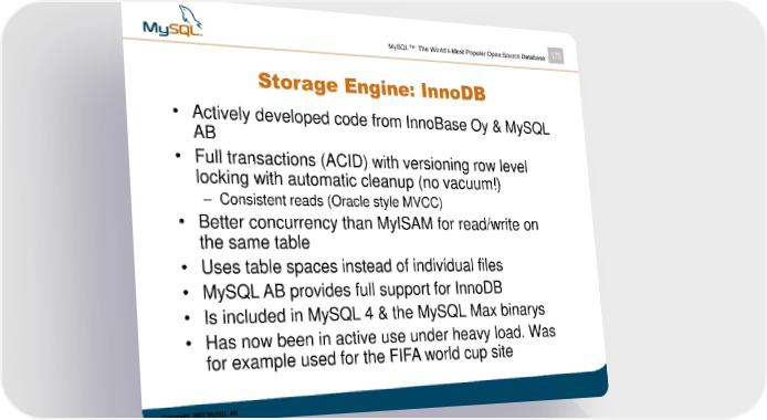 MySQL™: The World’s Most Popular Open Source Database 179 Storage Engine: InnoDB • Actively developed code from InnoBase Oy & MySQL AB • Full transactions (ACID) with versioning row level locking with automatic cleanup (no vacuum!) – Consistent reads (Oracle style MVCC) • Better concurrency than MyISAM for read/write on the same table • Uses table spaces instead of individual files • MySQL AB provides full support for InnoDB • Is included in MySQL 4 & the MySQL Max binarys • Has now been in active use under heavy load. Was for example used for the FIFA world cup site Copyright 2003 MySQL AB