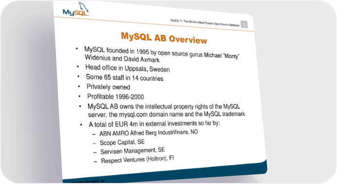 MySQL™: The World’s Most Popular Open Source Database 42 MySQL AB Overview • MySQL founded in 1995 by open source gurus Michael ”Monty” Widenius and David Axmark • Head office in Uppsala, Sweden • Some65staff in 14 countries • Privately owned • Profitable 1996-2000 • MySQL AB owns the intellectual property rights of the MySQL server, the mysql.com domain name and the MySQL trademark • A total of EUR 4m in external investments so far by: – ABN AMRO Alfred Berg Industrifinans, NO – Scope Capital, SE – Servisen Management, SE – Respect Ventures (Holtron), FI Copyright 2003 MySQL AB