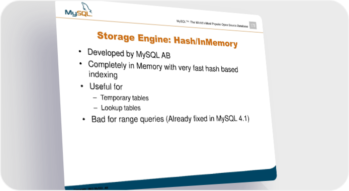 MySQL™: The World’s Most Popular Open Source Database 178 Storage Engine: Hash/InMemory • Developed by MySQL AB • Completely in Memory with very fast hash based indexing • Useful for – Temporary tables – Lookup tables • Bad for range queries (Already fixed in MySQL 4.1) Copyright 2003 MySQL AB