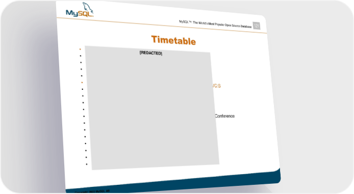 MySQL™: The World’s Most Popular Open Source Database 121 Timetable [REDACTED] • 4 Mar –ready to send out investment memo • 6-7 Mar –MGM in New York • 10-12 –MGM may be unavailable • 13-14 Mar –MGM at CeBIT • Week of 17 Mar –open for MGM, but HvB on holiday • 18 Mar –DEADLINE FOR OFFER LETTERS FROM VC:S • 22-25 Mar –MGM at PC Forum, Phoenix • 26-28 Mar –MGM in the SF Bay Area • Week of 31 Mar –open • 7-9 Apr– MGM in the SF Bay Area • 10-12 Apr –MGM in the SF Bay Area for MySQL Users Conference • 14-15 Apr –open • 16-21 Apr –MGM unavailable • 22-25 Apr –open • Week of 28 Apr –open • 5-7 May –open • 8-11 May –staff meeting in Budapest • Week of 12 May –open Copyright 2003 MySQL AB