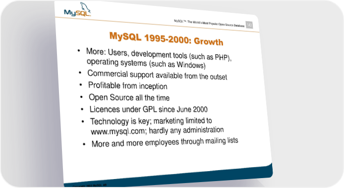 MySQL™: The World’s Most Popular Open Source Database 143 MySQL 1995-2000: Growth • More: Users, development tools (such as PHP), operating systems (such as Windows) • Commercial support available from the outset • Profitable from inception • Open Source all the time • Licences under GPL since June 2000 • Technology is key; marketing limited to www.mysql.com; hardly any administration • More and more employees through mailing lists Copyright 2003 MySQL AB
