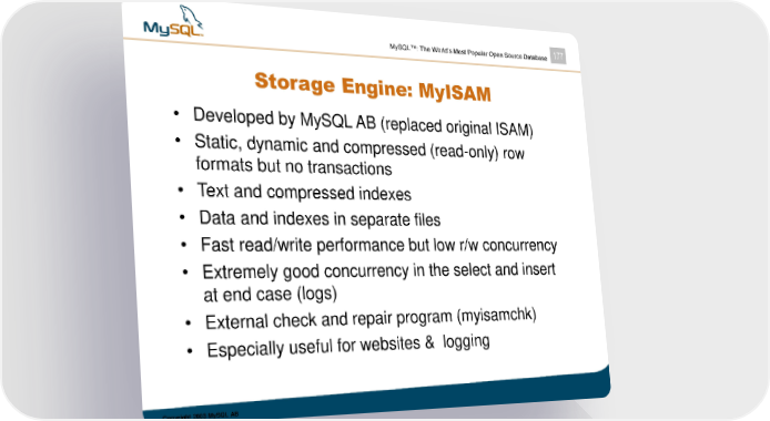 MySQL™: The World’s Most Popular Open Source Database 177 Storage Engine: MyISAM • Developed by MySQL AB (replaced original ISAM) • Static, dynamic and compressed (read-only) row formats but no transactions • Text and compressed indexes • Data and indexes in separate files • Fast read/write performance but low r/w concurrency • Extremely good concurrency in the select and insert at end case (logs) • External check and repair program (myisamchk) • Especially useful for websites & logging Copyright 2003 MySQL AB