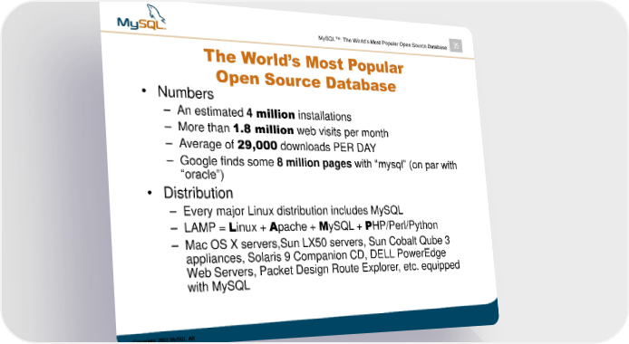 MySQL™: The World’s Most Popular Open Source Database 35 The World’s Most Popular Open Source Database • Numbers – An estimated 4 million installations – More than 1.8 million web visits per month – Average of 29,000 downloads PER DAY – Google finds some 8 million pages with “mysql” (on par with “oracle”) • Distribution – Every major Linux distribution includes MySQL – LAMP = Linux + Apache + MySQL + PHP/Perl/Python – Mac OS X servers,Sun LX50 servers, Sun Cobalt Qube 3 appliances, Solaris 9 Companion CD, DELL PowerEdge Web Servers, Packet Design Route Explorer, etc. equipped with MySQL Copyright 2003 MySQL AB