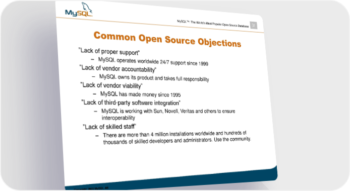 MySQL™: The World’s Most Popular Open Source Database 31 Common Open Source Objections ”Lack of proper support” – MySQL operates worldwide 24/7 support since 1999 ”Lack of vendor accountability” – MySQL owns its product and takes full responsibility ”Lack of vendor viability” – MySQL has made money since 1995 ”Lack of third-party software integration” – MySQL is working with Sun, Novell, Veritas and others to ensure interoperability ”Lack of skilled staff” – There are more than 4 million installations worldwide and hundreds of thousands of skilled developers and administrators. Use the community. Copyright 2003 MySQL AB
