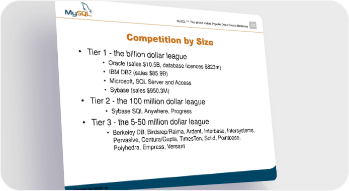 MySQL™: The World’s Most Popular Open Source Database 106 Competition by Size • Tier 1 - the billion dollar league • Oracle (sales $10.5B, database licences $823m) • IBM DB2 (sales $85.9B) • Microsoft, SQL Server and Access • Sybase (sales $950.3M) • Tier 2 - the 100 million dollar league • Sybase SQL Anywhere, Progress • Tier 3 - the 5-50 million dollar league • Berkeley DB, Birdstep/Raima, Ardent, Interbase, Intersystems, Pervasive, Centura/Gupta, TimesTen, Solid, Pointbase, Polyhedra, Empress, Versant Copyright 2003 MySQL AB