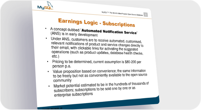MySQL™: The World’s Most Popular Open Source Database 59 Earnings Logic - Subscriptions • A concept dubbed ”Automated Notification Service” (ANS) is in early development • Under ANS, customers are to receive automated, customised, relevant notifications of product and service changes directly to their email, with clickable links for activating the suggested operations (such as product updates, database health checks, etc.) • Pricing to be determined, current assumption is $80-200 per person p.a. • Value proposition based on convenience; the same information to be freely but not as conveniently available to the open source community • Market potential estimated to be in the hundreds of thousands of subscribers; subscriptions to be sold one by one or as enterprise subscriptions Copyright 2003 MySQL AB