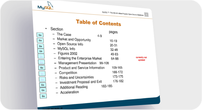 MySQL™: The World’s Most Popular Open Source Database 4 Table of Contents • Section pages Go – The Case 4-9 Go – Market and Opportunity 10-19 – Open Source Info 20-31 Go – MySQL Info 32-48 Go – Figures 2002 49-63 Go – Entering the Enterprise Market 64-98 currently not updated Go – Management Presentation 99-108 Go – Product and Service Information 109-165 Go – Competition 166-172 Go – Risks and Uncertainties 173-175 Go – Investment Proposal and Exit 176-182 Go – Additional Reading 183-185 – Acceleration Go Copyright 2003 MySQL AB