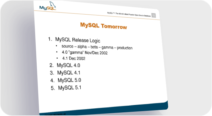 MySQL™: The World’s Most Popular Open Source Database 153 MySQL Tomorrow 1. MySQL Release Logic • source – alpha – beta – gamma – production • 4.0 ”gamma” Nov/Dec 2002 • 4.1 Dec 2002 2. MySQL 4.0 3. MySQL 4.1 4. MySQL 5.0 5. MySQL 5.1 Copyright 2003 MySQL AB