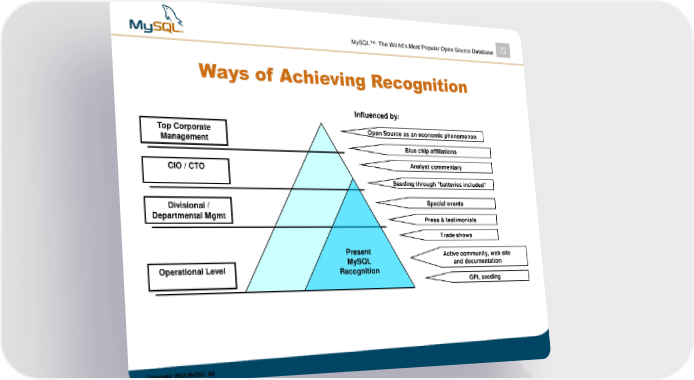 MySQL™: The World’s Most Popular Open Source Database 72 Ways of Achieving Recognition Influenced by: Top Corporate Open Source as an economic phenomenon Management Blue chip affiliations CIO / CTO Analyst commentary Seeding through ”batteries included” Divisional / Special events Departmental Mgmt Press & testimonials Trade shows Present Active community, web site Operational Level MySQL and documentation Recognition GPL seeding Copyright 2003 MySQL AB
